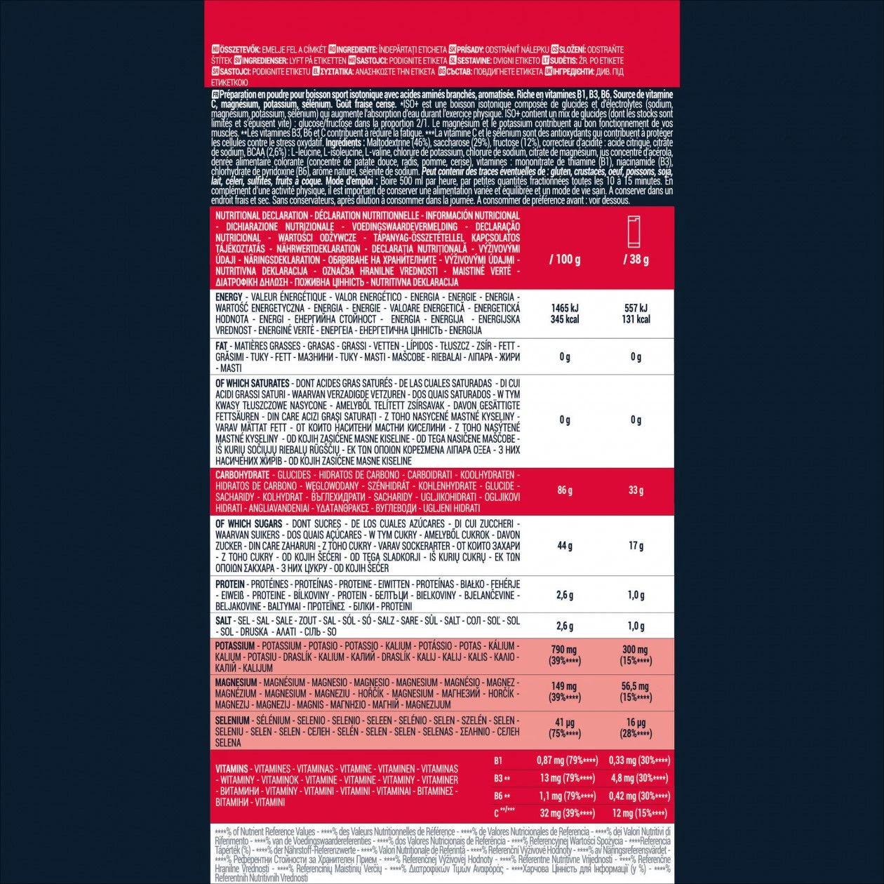 Powder preparation for isotonic sports drink with branched amino acids, flavored. Rich in vitamins B1, B3, B6. Source of vitamin C, magnesium, potassium, selenium. Strawberry cherry taste. Ingredients: Maltodextrin (46%), sucrose (29%), fructose (12%), acidity regulator: citric acid, sodium citrate, BCAA (2.6%): L-leucine, L-valine, L- isoleucine, potassium chloride, sodium chloride, magnesium citrate, concentrated acerola juice, coloring foodstuff (sweet potato concentrate, radish, apple, cherry), vitamins: thiamine mononitrate (B1), niacinamide (B3), pyridoxine hydrochloride (B6), natural flavor, sodium selenite. May contain possible traces of: GLUTEN, CRUSTACEANS, EGGS, FISH, SOY, MILK, CELERY, SULPHITES, NUTS.