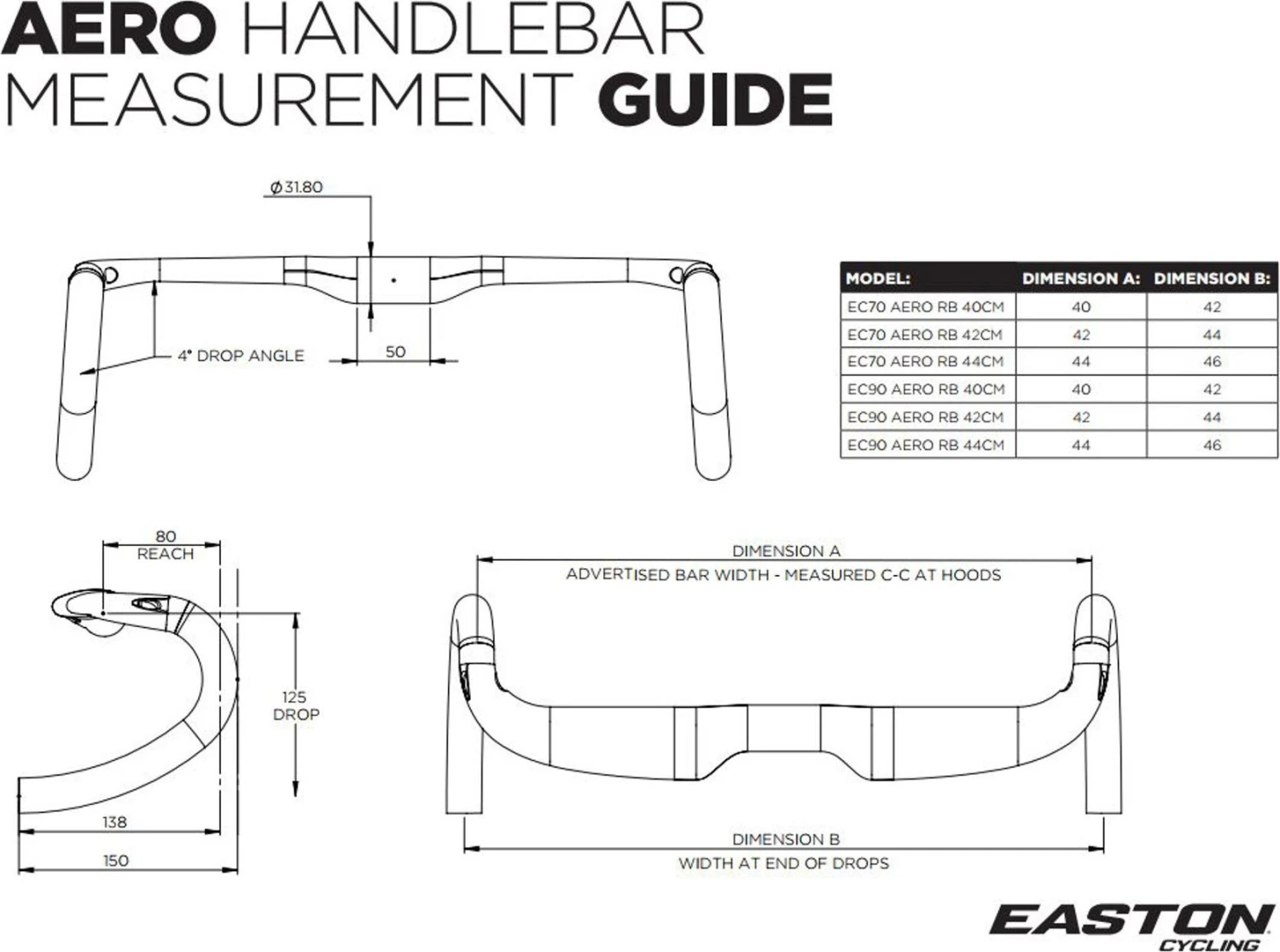 With the EC70 Aero, you’ll stay comfortable while reducing drag. Thanks to the flattened top profile with internal cable routing and MCD shape technology, this handlebar provides more comfort during long days in the saddle while cheating the wind. And with Easton’s proven composite TaperWallâ„¢ technology and Intelligent Flexibility, the EC70 Aeros nice and light at just 255-grams (42cm). The EC70 Aero is available in the three most common widths: 40-, 42- and 44-centimeters. Please see below for our handlebar measurement guide