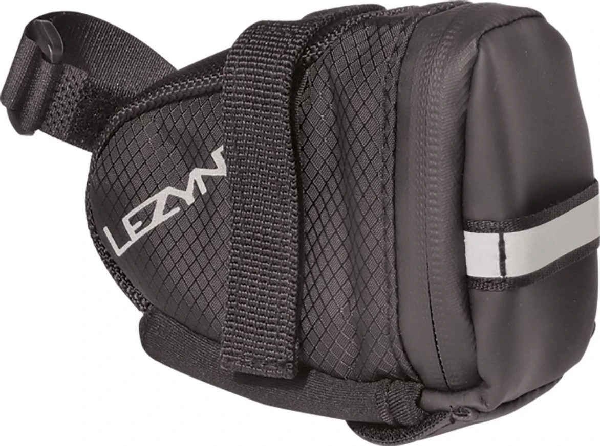 Small, wedge-shaped saddle bag. Velcro straps attach to saddle rails and seat post. Durable woven nylon construction. Labeled internal organizational pockets. External, quick access multi-tool sleeve. Reflective logos and loop increases night visibility. Water resistant zipper with large pull loop.Â