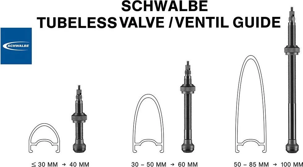 The new Schwalbe tubeless valves are available in 40mm, 60mm and 100mm lengths, a valve solution to suit every rim height. They feature a sophisticated aluminum design that is reliable and easy to use.