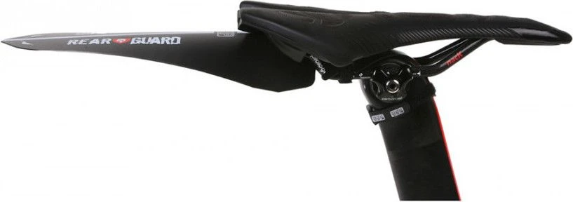 The perfect last minute mudguard. Very effective and fast fitting, RearGuard simply attaches the saddle rails with 2 velcro straps. It takes only 30 seconds! RearGuard offers great protections for your rear whether your on or off road. Thanks to a custom thickness polypropylene, RearGuard is not flimsy, but also offers an excellent fit, unlike some guards available. The tough fitting strap will work with any post including aero posts.Â