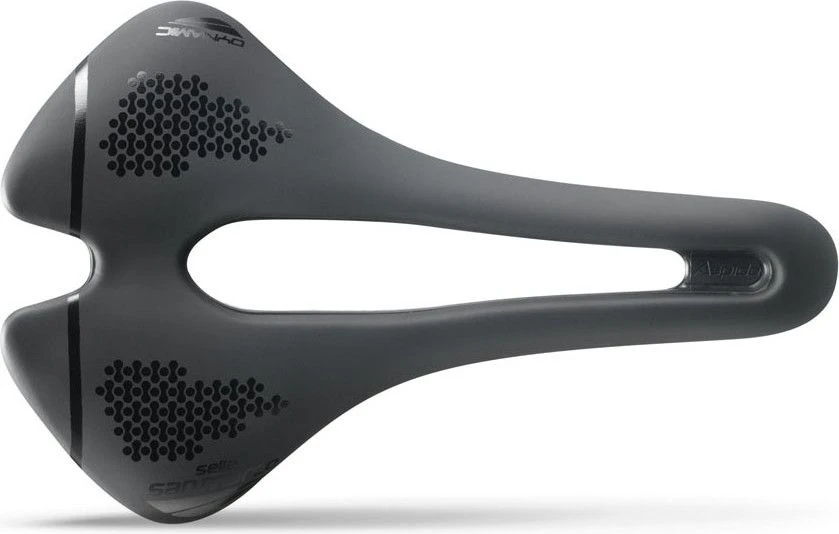 The Aspide Dynamic saddle has the virtue of satisfying the most demanding cyclists and it never disappoints those who test it for the very first time. It is a light and comfortable saddle that ensures remarkable performances. The design is unique: an essential shape synonym for lightweight and comfort. The ergonomics have been redefined through a specific study in order to find a perfect balance between support and relief zone.