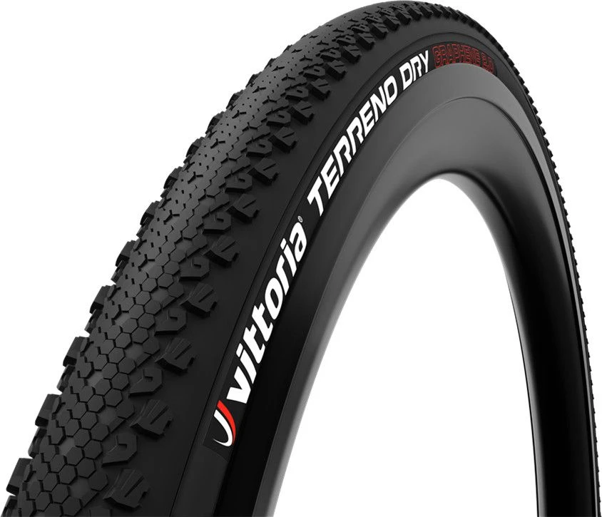 The Vittoria Terreno Dry tire is specially designed for Gravel (40-47mm) or Cyclo cross (33mm) for dry terrain, its aggressive tread with ultra-flat stud design gives it excellent performance on fast terrain so its side crampons allow safe passage of curves.