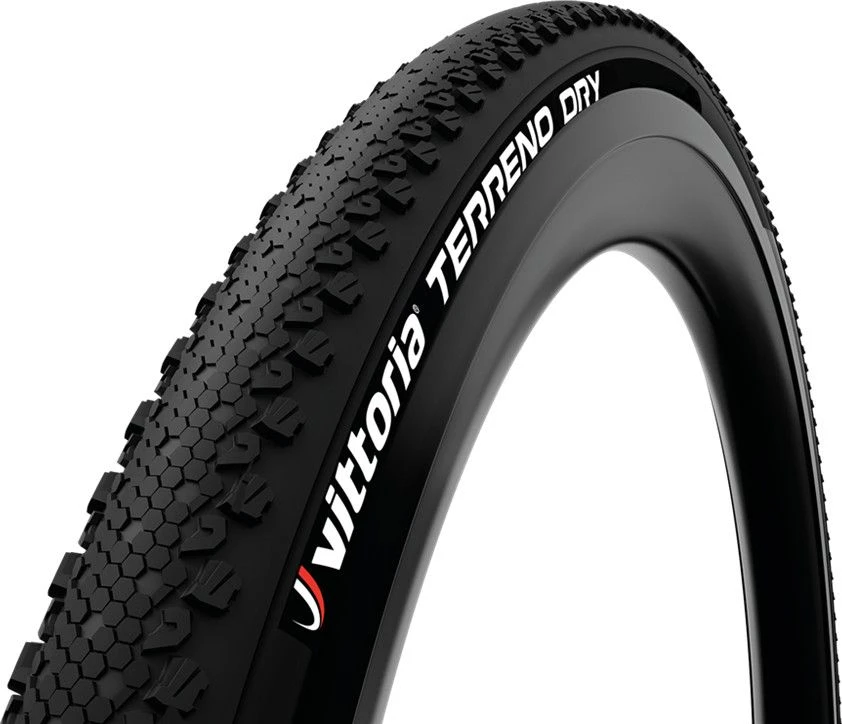 The Vittoria Terreno Dry tire is specially designed for Gravel (40-47mm) or Cyclo cross (33mm) for dry terrains, its aggressive tread with ultra-flat stud design gives it excellent performance on fast terrain so its side crampons allow safe passage of curves.